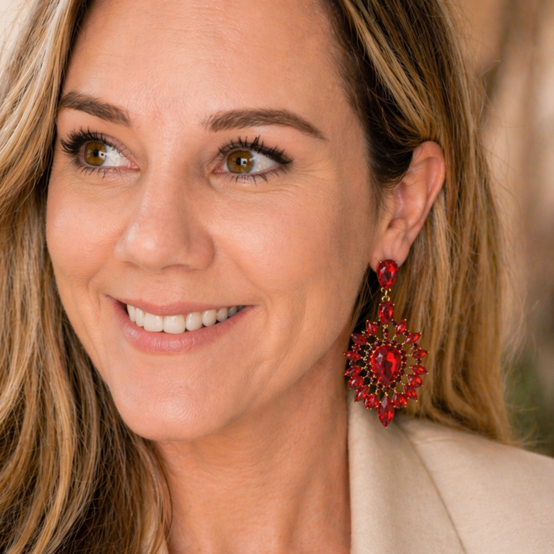 Statement Oorbellen Strass RoodElegante rode kristallen oorbellen met luxe druppelvormig ontwerp. Perfect voor een glamoureuze uitstraling.