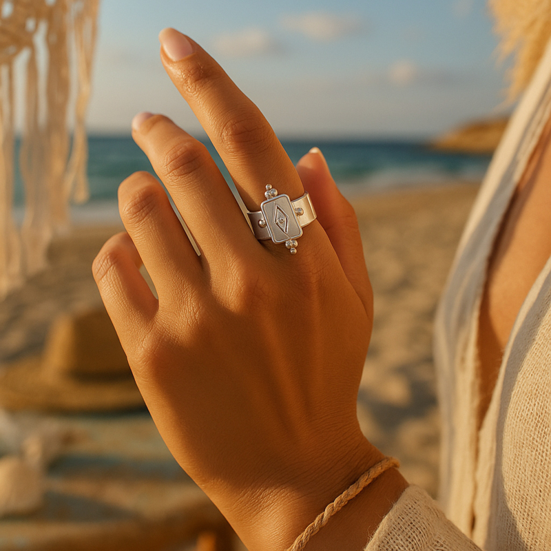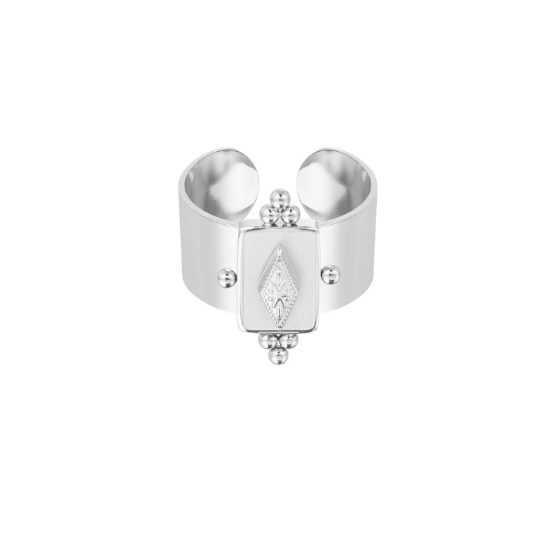 Deze zilverkleurige brede ring combineert een stoere uitstraling met verfijnde details. Het opvallende rechthoekige middendeel is voorzien van een subtiel vintage patroon en omlijst door kleine bolaccenten. Dankzij het open design is de ring verstelbaar en daardoor comfortabel te dragen. Perfect voor wie houdt van een statement sieraad dat kracht en elegantie uitstraalt. Ideaal te combineren met andere zilverkleurige sieraden voor een complete en trendy look.