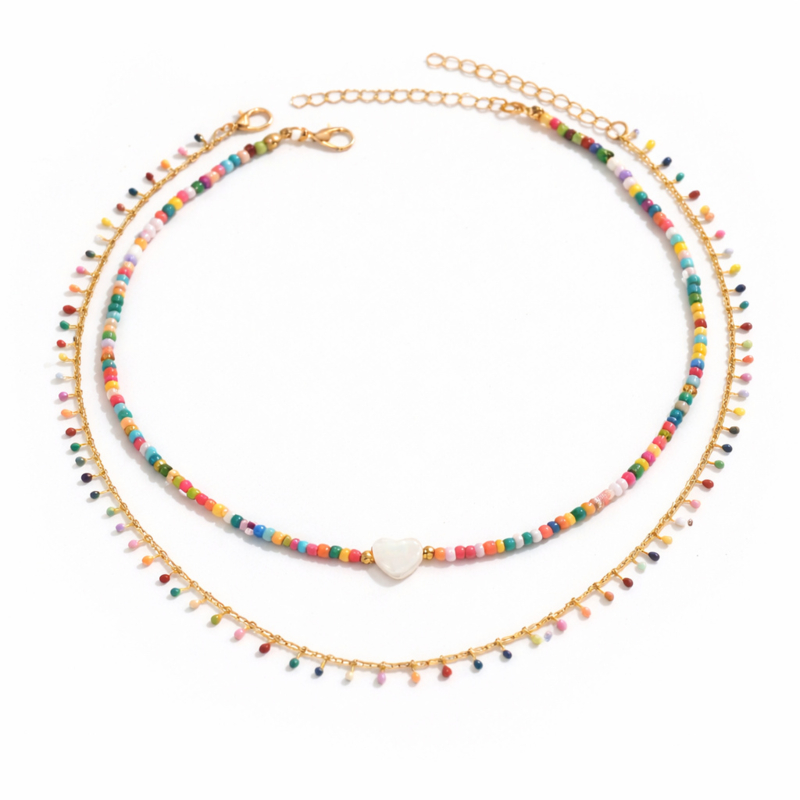Deze speelse set van twee kettingen geeft jouw look direct een zomerse Ibiza vibe. De bovenste ketting bestaat uit kleurrijke kralen met een subtiel hartje in het midden. De onderste ketting is goudkleurig en afgewerkt met kleine, gekleurde bedeltjes die zorgen voor een speels effect. Perfect om samen te dragen voor een layered look of los van elkaar te combineren. Lichtgewicht, vrolijk en ideaal voor elke dag of een festival outfit.