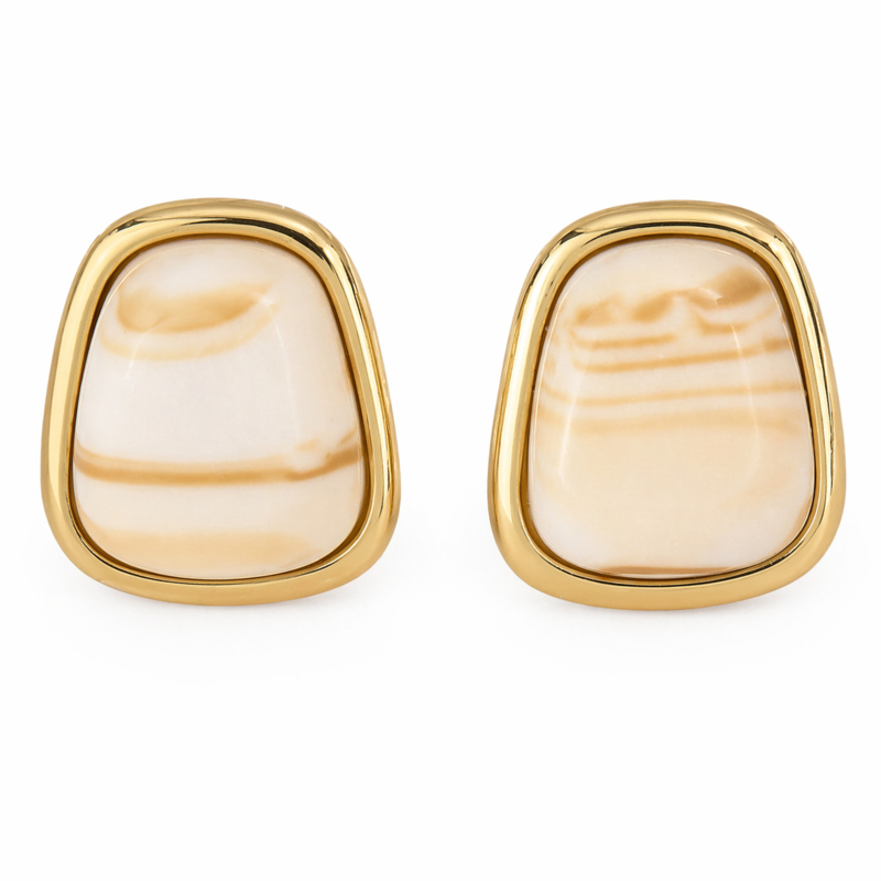 Deze stijlvolle clipoorbellen combineren een unieke marmerlook met een elegante goudkleurige rand. De vierkante vorm geeft de oorbellen een moderne en luxe uitstraling, perfect voor zowel dagelijkse outfits als speciale gelegenheden. Dankzij de clip sluiting draag je deze oorbellen comfortabel zonder gaatjes. De lichte tinten in de steen zorgen voor een zachte, Ibiza geïnspireerde vibe. Ideaal voor liefhebbers van statement oorbellen en clip oorbellen die net even anders zijn.